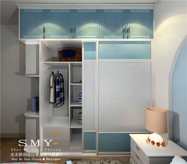 墻面:為呼應(yīng)房間整體主題,提升整個房間的一體性。衛(wèi)生間墻面使用玻璃馬賽克飾面、藍白色弧形設(shè)計。