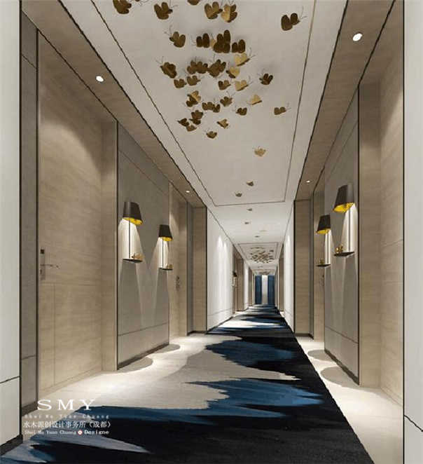 走廊時(shí)同樣使用的藍(lán)黃色調(diào),酒店設(shè)計(jì)原則之一就是保證酒店風(fēng)格的統(tǒng)一,走廊不規(guī)則的圖案便于大堂的圖案相一致,燈光彩用黃色燈罩來遮光,避免了燈太亮的刺激感,同時(shí)增加了舒適感;走廊的頂上使用金黃色的蝴蝶裝飾點(diǎn)綴,如同漫步在天空與海洋之間一樣,有一絲活潑俏皮的感覺。