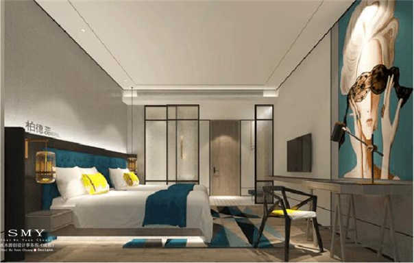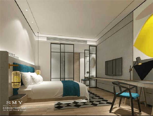 本案設(shè)計(jì)師打造的一家簡約風(fēng)的商務(wù)酒店,設(shè)計(jì)師在酒店設(shè)計(jì)時(shí)經(jīng)過嚴(yán)格考察,精心的將新中式簡約風(fēng)設(shè)計(jì)成簡約而不簡單的酒店風(fēng)格,如湖水天空一般的藍(lán)色與溫暖明亮的亮黃色組合在一起時(shí)碰撞出一種親切中帶有一絲高冷、柔和中帶有一絲堅(jiān)強(qiáng),將憂郁的藍(lán)色與溫暖的黃色搭配使用正是巧妙運(yùn)用了冷色調(diào)與暖色調(diào)調(diào)和而出的一種色彩的跳躍,不會讓二種顏色搭得很牽強(qiáng)。