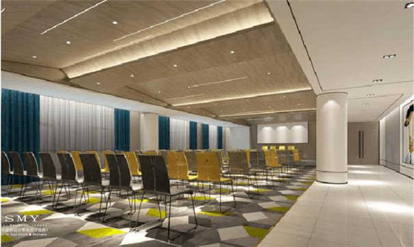 酒店配置多功能廳,能容納100人會議,多功能商務(wù)廳設(shè)計(jì)也很時(shí)尚,座椅彩用兩色交替,讓整個會議多姿多彩,整個大廳色彩與酒店設(shè)計(jì)主色統(tǒng)一,藍(lán)色窗簾遮光性好,廳頂采用簡約的燈光設(shè)計(jì),保證足夠亮度的同時(shí)有減輕了廳頂?shù)姆Q重能力。